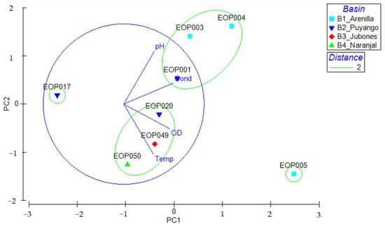 Principal Component Analysis (PCA) for environmental variables with overlaid average clustering from El Oro Province watersheds: B1: Arenillas, B2: Puyango, B3: Jubones, and B4: Siete River.