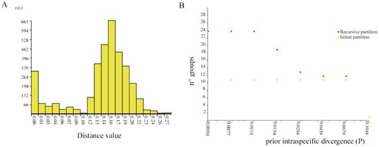 Results generated from ABGD method: (A) pairwise Jukes Cantor distances histogram. The horizontal axis shows the pairwise JC-distance, and the vertical axis shows the number of pairwise sequence comparisons; (B) number of OTUs with prior intraspecific divergence based on DNA barcodes of Polypedilum specimens from Ecuador, Colombia and Chile.