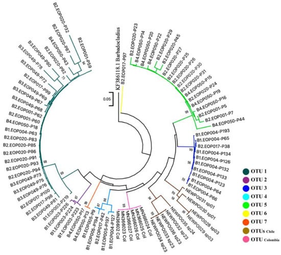 The phylogenetic analysis supported the groups inferred from the ABGD method. The mPTP model produced a total of 11 clusters. In the mPTP (Figure S1) and ML analyses (Figure 5), the specimens grouped in each OTU formed a well-supported monophyletic clade except for specimen p32 that was clustered in the OTU1 clade. Nevertheless, some distant geographical populations formed nested clades. For example, Llanquihue’s (Chile) OTU with El Oro’s OTUs 3 and 5 were grouped in the same clade. DNA barcode clusters from Chile showed a high genetic dissimilarity among specimens. Chilean specimens were divided into four species in the BOLD database.