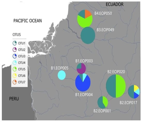 We considered seven OTUs from El Oro that had an intraspecific divergence ranging from 0.4% to 5% for further analysis (Table 3). These OTUs had a dissimilarity ranging from 17% to 30%. These results demonstrated a high Polypedilum species diversity (based on the number of OTUs) in El Oro Province. The species separation analysis indicated three abundant Polypedilum putative species that included OTUs 1, 3 and 5. Specimens from four river basins in El Oro were included in OTU1, making it the most abundant and widespread OTU. Specimens from Arrenillas and Puyango basins were grouped into OTU3 and OTU4, respectively, while individuals from the Puyango and Siete basins were included in OTU5. OTU2 and 7 had only one to three individuals collected from a single river basin (Figure 6). It is important to highlight that EOP003, EOP004 and EOP017 sites are located between 1015 and 1293 masl, while the other sites are located below 991 m.a.s.l.