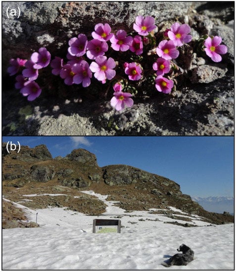 Androsace brevis (Figure 1a) is a narrow-endemic cushion plant that grows above 2000 m asl on rocky ridges and outcrops in a limited area in the southern Alps of northern Italy (Lombardy) and neighbouring Switzerland, in few and scattered populations of limited size. Its conservation status in Italy is vulnerable (VU) according to IUCN criteria []. The flowering period is very short, typically lasting about 2 weeks between the end of May and the beginning of June. It occurs where the snow has just melted, while in the immediate vicinity, it is still present in patches (Figure 1b). Each plant carries from a few to about 200 solitary flowers (ca. 4 mm long) with a pink corolla (ca. 8 mm in diameter) and a yellow mouth (ca. 0.9 mm in diameter); flowers are held by 0.5–2 cm erect pedicels [,].