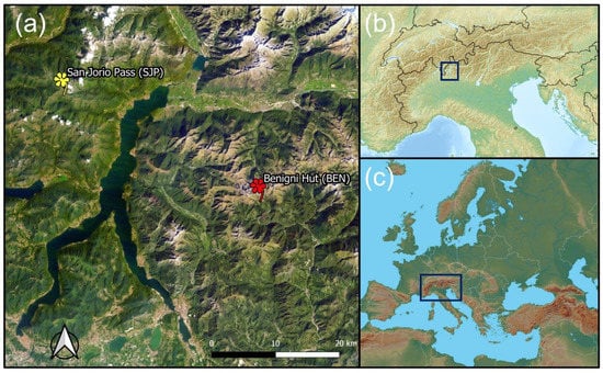 The present study was conducted in the Alpine biogeographical region [] in the southern Alps of northern Italy. Two sites were selected across the A. brevis distribution range: San Jorio Pass—Cima di Cugn (SJP) in the Lepontine Alps (Como, Lombardy) and Mountain Hut ‘Cesare Benigni’ (BEN) in the Orobic Alps (Bergamo, Lombardy) (Figure 2).