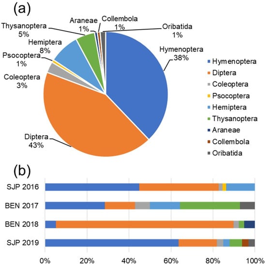 Among Diptera, 45% of the species belonged to the family Anthomyiidae, followed by Sphaeroceridae (13%), Sciaridae (12%), Chironomidae (10%), and Chloropidae (5%), while Agromyzidae, Anthomyzidae, Cecidomyiidae, Drosophilidae, Lonchopteridae, Phoridae, and Sepsidae were each represented by less than 5% of the sampled Diptera (Table S3). Regarding Hymenoptera, the sampled specimens belonged to the families Formicidae (45%), Braconidae (26%), and Eulophidae (6%); the sample rates for Ceraphronidae, Encyrtidae, Figitidae, Ichneumonidae, Megaspilidae, Mymaridae, Pteromalidae, Scelionidae, and Torymidae were all less than 5%. All the identified Hemiptera belonged to Aphididae, and all Thysanoptera to Thripidae. Coleoptera were represented by Chrysomelidae, Coccinellidae, Meloidae, and Staphylinidae (25% each, one specimen each family). For Collembola, Psocoptera, and Araneae, a single specimen was sampled for each order, belonging to the families of Entomobryidae, Ectopsocidae, and Linyphiidae, respectively.