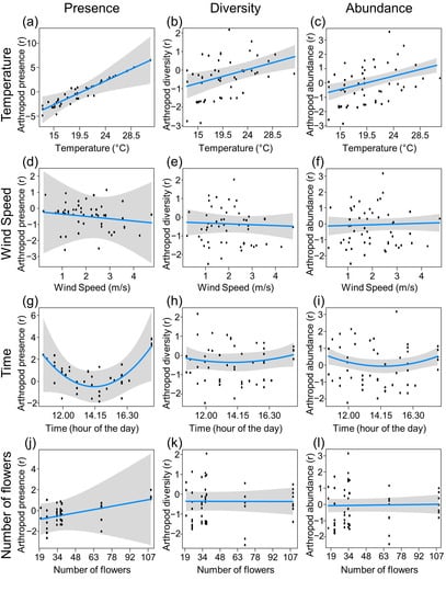 Partial residual plots showing the influence of temperature (a–c), wind speed (d–f), time (quadratic) (g–i), and number of flowers (j–l) on the presence (a,d,g,j), diversity (b,e,h,k) and abundance (c,f,i,l) of flower-visiting arthropods. Each black dot represents a sampling session. Blue lines indicate the mean value obtained using GLMs, while shaded areas represent 95% confidence bands; r = residuals.
