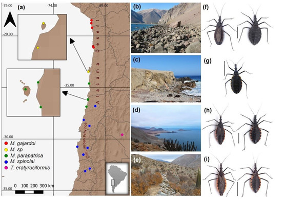 (a) Collection sites of Mepraia species with the biogeographic characteristics of the current habitats. (b) Sampling site of M. gajardoi in the extreme north of the coastal Atacama Desert (Caleta Vitor), photograph by Ricardo Campos-Soto. (c) Sampling site of M. sp. on the coast of the Mejillones Peninsula (Santa María Island) in the Atacama Desert, photograph by Ricardo Campos-Soto. (d) Habitat of M. parapatrica in the Pan de Azúcar National Park in the Atacama Desert, photograph by Ricardo Campos-Soto. (e) Sampling site of M. spinolai in the interior valley of central Chile in the Coquimban Biogeographical Province [17], photograph by Ricardo Campos-Soto. (f) Adult M. gajardoi, male on the left and female on the right, photographs by Vicente Valdés. (g) Female adult M. sp., photograph by Ricardo Campos-Soto (h) Adults of M. parapatrica, male on the left and female on the right, photographs by Vicente Valdés. (i) Adult M. spinolai, male on the left and female on the right, photographs by Vicente Valdés. The vertical black bar represents one centimetre.