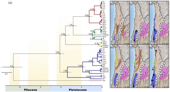The PCO would have had a greater impact on the northern clade than on the southern clade. This greater impact was expressed as a major diversification between 1.8 and 1.4 Mya, which drove the origin of three species (Figure 3f), each one also genetically quite structured. All intraspecific structuring processes would have occurred in the last 0.9 Mya, which is congruent with the other colonization process in surrounding areas of the Atacama Desert [3,30].
