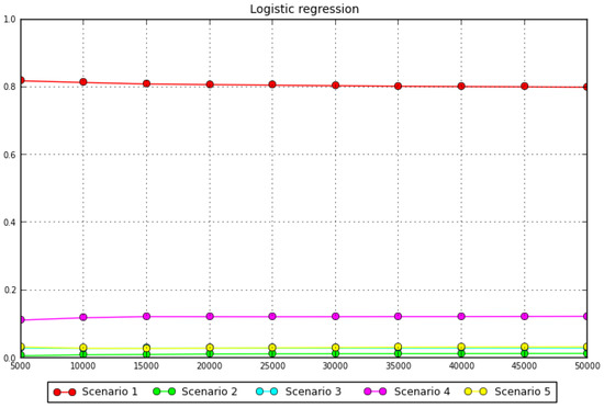 Graph of the posterior probabilities of each scenario estimated using a logistic regression approach.