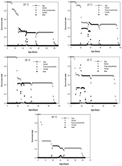 The highest pre-adult survival was recorded at 32 °C (93%), followed by 26, 23, and 20 °C, respectively, and the significantly lower survival rate (28%) was recorded at 40 °C, but the highest sex ratio (proportion of females) (0.80) was observed at 40 °C (Table 2).