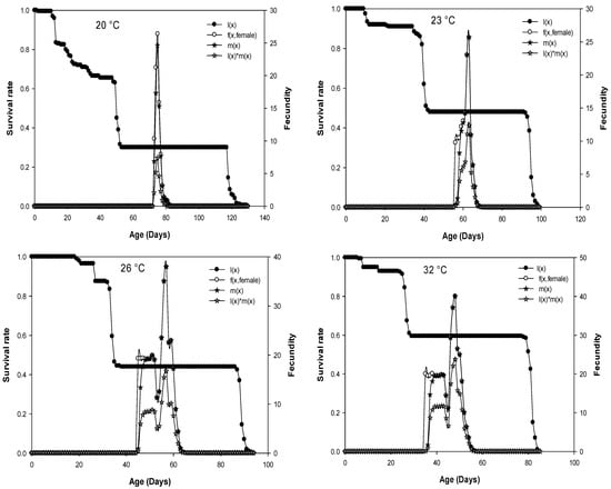 The average number of eggs produced by a D. opuntiae individual of age x and stage j per day is plotted as age-stage fecundity (fxj) in Figure 2. Because only females produce offspring, there is only one curve f (x, female) that represents the females’ life-history stage. The age-specific survival rate curves (lx) describe the change in survival history of the whole cohort with age when all stages are represented, and age-specific fertility (mx) is the number of offspring born per female [20,21,22]. The age-specific survival curves (lx) that were presented in Figure 2 are temperature-dependent. The curves for age-stage specific fecundity (fx, female), age-specific fertility (mx), and age-specific maternity (lxmx) showed several peaks, with the highest peaks observed at 26 and 32 °C (Figure 2).
