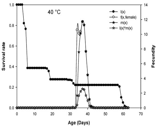 The age-stage-specific survival rate (sxj) indicates the probability that a newborn egg will survive to age x and stage j (Figure 1). Significant overlap between stages was observed for all temperatures tested due to the variable developmental rates among individuals. The probability that a newly laid egg would survive to the adult stage was as follows: 20 °C (0.30, 0.35); 23 °C (0.48, 0.34); 26 °C (0.44, 0.44); 32 °C (0.60, 0.34); 40 °C (0.22; 0.06) for females and males, respectively. The probability was the highest at 26 °C while it was the lowest at 40 °C for males. In the case of females, the percentage of survival from egg to adult development was the highest at 32 °C. There was no difference in this probability of survival between males and females at 26 °C.