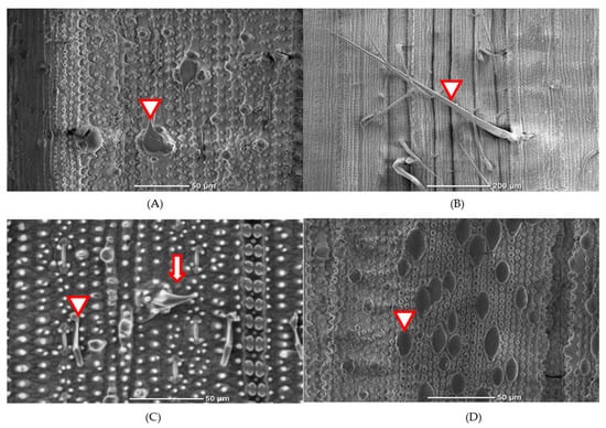 The scanning electron microscopy (SEM) observation of rice leaf surface at 500× magnification. Rice trichomes found in selected varieties were classified as follows (A) arrowhead: prickle trichome; (B) arrowhead: macro trichome; (C) arrow: micro trichome; arrowhead: glandular trichome; and (D) arrowhead: Papillae.