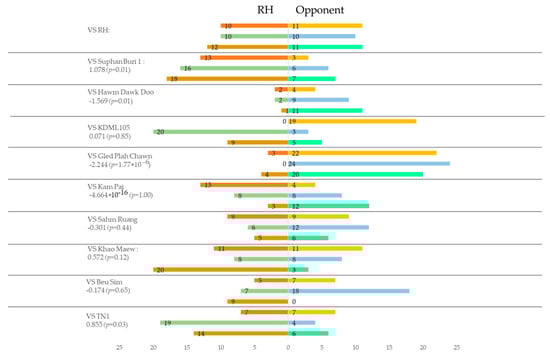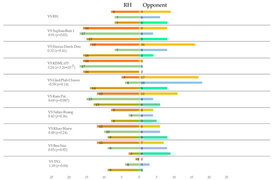 When using rice plants infested by BPH (Figure 3), the number of varieties that were less preferred than RH decreased from eight to four. Among these, only Suphan Buri 1 and TN1 were significant (p < 0.05, logistic regression). However, those more preferred increased from one to five, although significant effects were found only in Hawm Dawk Doo and Gled Plah Chawn (p < 0.05, logistic regression). Compared with the results before BPH infestation, the relative preference for RH, which was evaluated by the coefficients, generally increased in all the other varieties with smaller coefficient values than before BPH infestation.