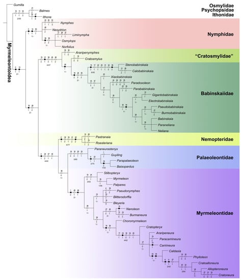 Figure 4. Phylogeny and evolutionary chronogram of extinct and extant Myrmeleontoidea. Topology represents the strict consensus tree of the two most parsimonious trees yielded from TNT. Unambiguous state changes of the morphological characters at the familial and higher level are shown on the tree. Black circle represents the homologous state and white circle represents the homoplasious state. Bremer support values/bootstrap values are shown at relevant nodes.