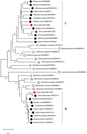 - Wu, Y.K.; Zou, C.; Fu, D.M.; Zhang, W.N.; Xiao, H.J. Molecular characterization of three Hsp90 from Pieris and expression patterns in response to cold and thermal stress in summer and winter diapause of Pieris melete. Insect Sci. 2018, 25, 273–283. [Google Scholar] [CrossRef]