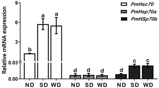 3.3. Expression Patterns of PmHsc70, PmHsp70a, and PmHsp70b in Pupae of ND, SD, and WD Pupae