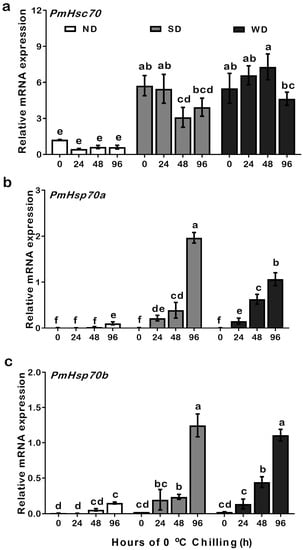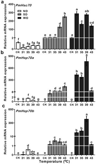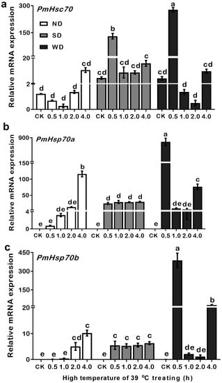 3.5. Expression Patterns of PmHsc70, PmHsp70a, and PmHsp70b in ND, SD and WD Pupae during Heat Treatments