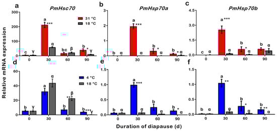 3.7. Expression Patterns of PmHsc70, PmHsp70a, and PmHsp70b during Procedures of Summer and Winter Diapause Development