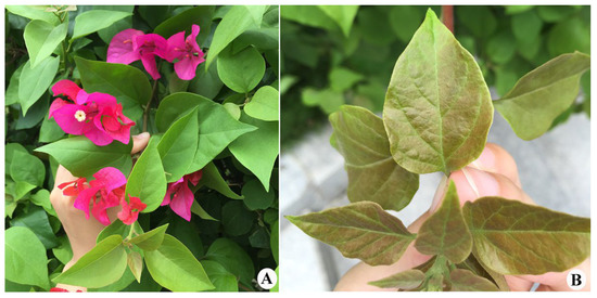 Host plant and damage symptom. (A) host plant (Bougainvillea spectabilis); (B) damage symptom.