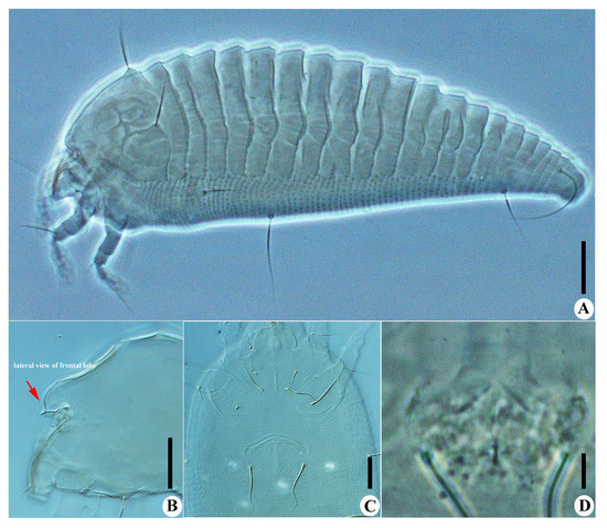 Calvittacus spectabilus sp. nov. (A) lateral view; (B) lateral view of gnathosoma; (C) male coxigenital area; (D) female internal genitalia. Scale bar: 20 μm for A; 10 μm for (B,C); 5 μm for (D).