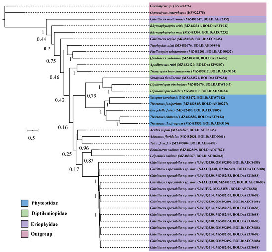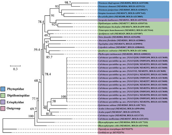 The Eriophyoidea includes three families, i.e., Phytoptidae, Eriophyidae, and Diptilomiopidae [11]. To test the phylogenetic position of Calvittacus spectabilus sp. nov. within Eriophyoidea, we constructed an additional data matrix including five species of Phytoptidae (i.e., Trisetacus ehmanni, Trisetacus thujivagrans, Trisetacus juniperinus, Boczekella fabris, Setoptus koraiensis), nine species of Eriophyidae (i.e., Aculus ichnocarpi, Phyllocoptes taishanensis, Surapoda tianlinensis, Aculus populi, Leipothrix sabinae, Tetra zhouzhis, Tegolophus ulmi, Abacarus floridulus, Epitrimerus sabinae), and seven species of Diptilomiopidae (i.e., Apodiptacus rubi, Diptilomiopus nobilus, D. bischofiae, Quadracus cudraniae, Rhyncaphytoptus mori, R. celtis, Trimeroptes luanchuanensis). Osperalycus tenerphagus and Gordialycus sp. from the family Nematalycidae were used to root the tree because they were suggested to be the sister group of Eriophyoidea [19,20]. All COI sequences were aligned using MAFFT v7.2 [21]. The best-fit DNA sequence evolution model for our data was selected using the Bayesian information criterion (BIC) in jModelTest ver. 2.1.1 [22] with the GTR+G+I model selected for COI. Phylogenetic analyses were conducted using maximum likelihood (ML) and Bayesian inference (BI). ML analyses were performed using nucleotide sequences in the RAxML-HPC2 on XSEDE (3.2.3) [23] implemented in CIPRES Science Gateway V. 3.3 [24], using nonparametric bootstrap with 1000 replicates for node support. BI analyses were computed with MrBayes 3.2.6 [25], using two separate data partitions for codons (1st+2nd, 3rd). Two parallel runs of four independent chains were conducted for 10 × 107 generations with samples every 1000 generations. The first 25% of the samples were discarded as burn-in.