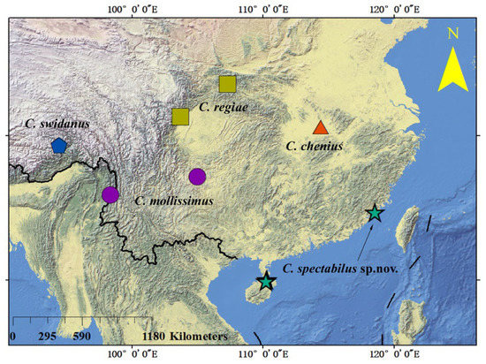The genus Calvittacus was established by Xue et al. [7] based on the type species C. regiae Xue, Song & Hong 2006, which was collected from the Oriental Region (Figure 7). After that, three more species, collected from the Oriental Region, were assigned to this genus (Figure 7). Herein, the fifth species, C. spectabilus sp. nov., were also collected from the Oriental Region. Under these contexts, it is likely that the genus Calvittacus was endemic in the Oriental Region. However, more field surveys are warranted in future studies to understand the origin and biogeographical distribution of the Calvittacus species.