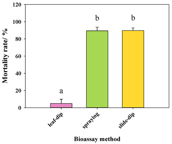 The mortality rates after 24 h of Tetranychus pueraricola under 6.67 g/L GC16 with different bioassay methods. Data are expressed as mean ± SE. Different lowercase letters represent significant differences at p < 0.05 based on a one-way ANOVA with Tukey’s HSD test.