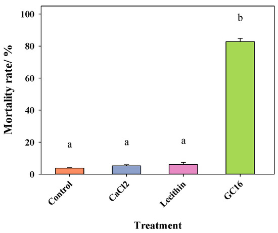 GC16 is composed of a mixture of CaCl2 and lecithin. To determine which component is the main active component and/or how the two components synergize, the lethal efficacy of each component was tested and the results were compared. The mortality rates of mites were less than 10% when CaCl2 or lecithin acted alone, and there were no significant differences between control and the CaCl2/lecithin alone groups. However, the mortality of mites treated for 24 h with GC16 reached 80%, and the coapplication of lecithin + CaCl2 significantly increased mortality compared with mites treated with lecithin or CaCl2 alone (Figure 2). These data indicated that CaCl2 or lecithin alone were not lethal to mites, but the combination of lecithin + CaCl2 (GC16) produced very different results.