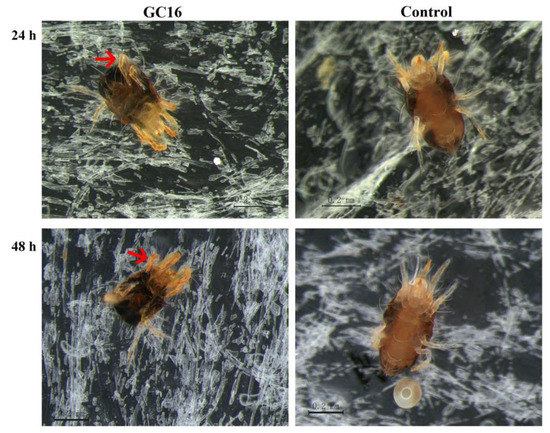 To observe poisoning symptoms [40,41,42], 25 mites were carefully transferred to bean leaves. T. pueraricola were treated with GC16 at concentrations of 6.67 g/L and 2.00 g/L by the spraying method, and water was used as the control. Observations were made under a microscope (SZ51, Olympus, Tokyo, Japan) at 20 min, 40 min, and then every 2 h from 2 to 24 h; each observation was made with three replicates.