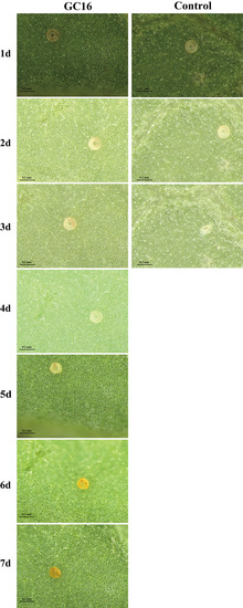 Fresh, healthy, and uniform female adult mites were selected and placed on common bean leaves. After 12 h of laying eggs, the adult mites were removed with a brush, and approximately 20 ~ 40 eggs were kept on each leaf [13,35]. The mite eggs were treated with 10 g/L GC16 by the petri dish-spraying method described above, with water as a control, and each treatment consisted of three biological replicates. The eggs were observed and photographed under a microscope (LEICA M205 FA, Wetzlar, Germany) every day, and the hatching rate and development time (time after egg lay) were calculated.