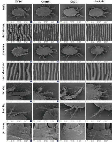 Scanning electron microscopy (SEM) observation of T. pueraricola after treated for 24 h. The treatments include GC16, Control (water), CaCl2, and lecithin. The parts that were photographed included the back, dorsal crest, abdomen, ventral texture, foreleg, hind leg, and peritreme.