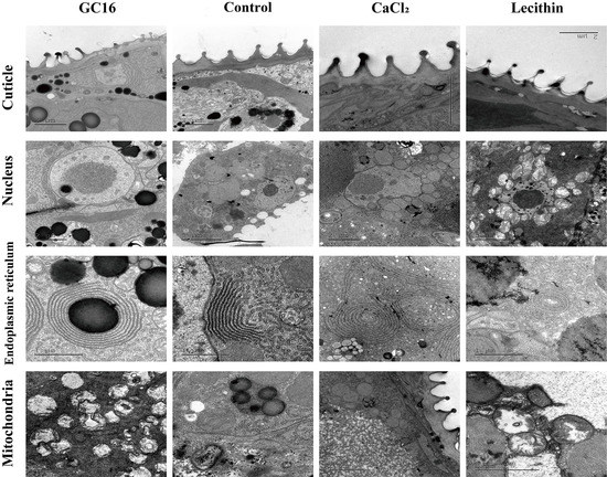 Transmission electron microscopy (TEM) observation of T. pueraricola after treated with GC16, Control (water), CaCl2, and lecithin for 24 h. The cuticle, nucleus, endoplasmic reticulum, and mitochondria of mites were photographed.
