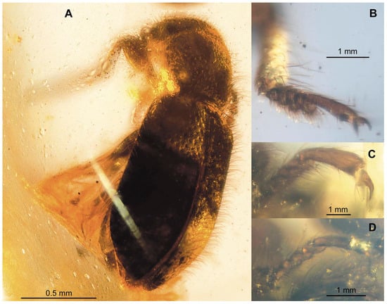 Pictures of Thanerosus antiquus gen. and sp. nov. holotype NIGP180154: (A) body of the holotype in a curved amber surface; (B) protarsi; (C) mesotarsi; (D) metatarsi.
