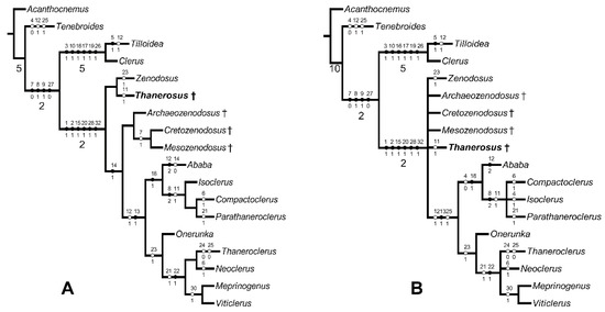 Zenodosus and Thanerosus share the open mesocoxal cavities (14-0) (mesepimeron touches mesocoxa) while all other thaneroclerids but Ababa Casey (character unknown in Mesozenodosus) have the cavities closed by projections of meso- and metaventrite which character state is considered apomorphic (14-1). That is the reason for the sister relation between Zenodosus and Thanerosus shown in Figure 4A. However, the analysis with unresolved relations among five ‘zenodosine’ taxa (Figure 4B) is more realistic because the relations figured in the previous analysis are, excepting mesocoxal cavities open/closed, based on unknown character states (?) in the fossil taxa and dubious observation of bidentate mandible in Cretozenodosus and Mesozenodosus (see above). No single taxon in the whole clerid lineage (Chaetosomatidae, former Metaxinidae, Thanerocleridae, Cleridae) has the bidentate mandible with two apical teeth situated side by side (or in the horizontal axis) as in other cleroids and the major part of cucujoid beetles. Moreover, as already noted above, the figure of the Mesozenodosus mandible shows the unidentate mandible [7].
