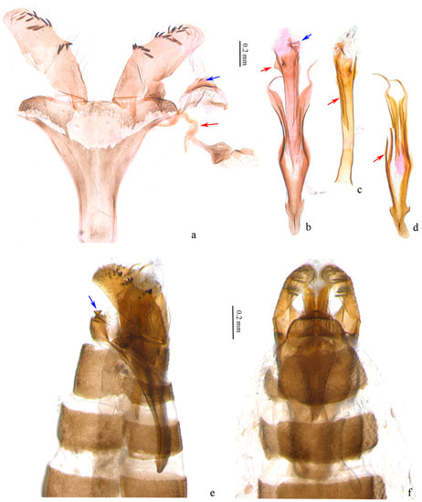 Male genitalia of Subclemensia taigae. (a) Genitalia with phallus detached, LIU0282, SDNU.Ent023846, blue arrow indicating the small sharp protrusion on tegumen, red arrow indicating the transtilla; (b) phallus, LIU0282, SDNU.Ent023846, red arrow indicating the small triangular protrusion, blue arrow indicating the cornuti; (c) phallus, LIU0288, SDNU.Ent023842, red arrow indicating the transtilla long ridge on outer wall; (d) juxta, LIU0288, SDNU.Ent023842, red arrow indicating the secondary branch; (e) genitalia in situ, lateral view, LIU0288, SDNU.Ent023842, blue arrow indicating the small sharp protrusion on tegumen; (f) foreleg, genitalia in situ, dorsal view, LIU0288, SDNU.Ent023842.