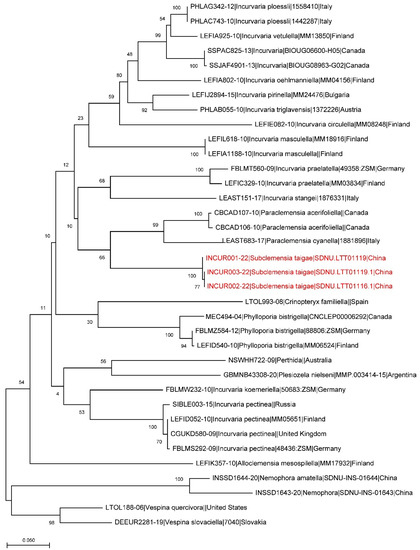 A maximum likelihood estimation based on available barcode sequences of Incurvariidae. The branches of Subclemensia taigae are marked red.