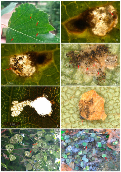 Biology of Subclemensia taigae. (a) Leaf mines of first-instar larvae as indicated by red arrows; (b) close-up view of early mine from upper side of leaf, arrow indicating head of larva; (c) close-up view of early mine from lower side of leaf, arrow indicating head of larva; (d) fecal pellets attached on lower surface of the mine with silk threads, arrows indicating the silk threads; (e) a hole on the leaf created by first-instar larva in case; (f) a single-layered portable case, arrow indicating the head of the larva; (g) damage by the larvae, arrows indicating the holes on leaves; (h) portable cases on the ground searching for overwintering place, arrows indicating two of the massive cases.