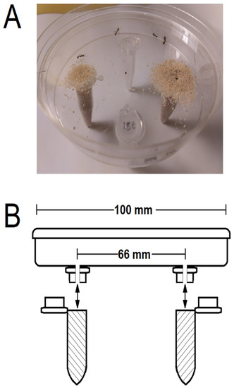 Bioassays were adapted from the S. invicta two-choice digging assay developed by Chen and Allen [41]. We modified this bioassay to include sand (Quikrete Premium, Home Depot, Cary, NC, USA) that was treated with a suspension of a bacterial isolate. Briefly, a plastic 100 mm dia. Petri dish (Fisherbrand, Thermo Fisher, Waltham, MA, USA) was used as a 2-choice arena (See Figure 1 for details). On the Petri dish bottom, the snap lids of two 1.25 mL centrifuge tubes were attached directly opposite and spaced 66 mm from one another. A hole (3 mm dia.) was drilled through the Petri dish bottom and each tube lid giving ants access to the interior of treatment and control sand tubes (described below) which were snapped onto the Petri apparatus for each assay. Worker ants (20 or 6 RIFA workers/assay, dependent on assay) were introduced into the assay arena and allowed access to the tubes to excavate sand. The quantity of sand excavated from each tube and the location of ants at the end of the assay were determined as outcomes (dependent variables). Prior to setting up each bioassay, sand was sifted through a 2 mm mesh sieve to remove large particles, autoclaved, and dried in a drying oven (50 °C, 24 h). Portions of the dry sand were transferred to sterile 1.25 mL centrifuge tubes. Each tube was filled to the top, capped, and weighed to the nearest mg using a precision scale (model XS-64, Mettler-Toledo, Columbus, OH, USA). Experimental tubes were treated with bacterial isolate suspensions and control tubes were treated with control preparations (previously described). Because 350 µL volumes of bacterial isolate suspensions were found to readily absorb into and throughout the dry sand without overflowing or pooling at the surface, this volume was used in all treatments.