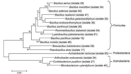 Colonies of purified bacterial isolates were identified by sequencing a fragment (600 base pairs) of the 16S rRNA gene. Seventeen isolates (Table 1) were selected and used in behavioral assays, including members of Firmicutes (n = 13), Actinobacteria (n = 3), and Proteobacteria (n = 1). Phylogenetic relationships among the selected bacteria are illustrated in Figure 2. The 16S rRNA sequences of the bacterial isolates were deposited in GenBank (Accession numbers MW255490 to MW255506).