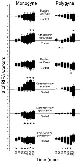 Location of monogyne and polygyne S. invicta in response to soil-derived bacterial isolates (5 × 108 cells/mL) or control (untreated) sand in 2-choice bioassays. Location of responders measured at several time intervals (min), terminating at 18 h; 6 worker ants/trial, n = 8 trials. Asterisks indicate significant preference (paired t-tests, α = 0.05) of RIFA workers. #: number.