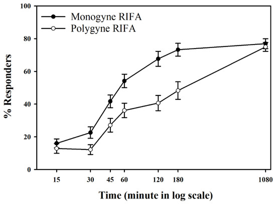 During the early time points (15, 30, and 45 min), monogyne and polygyne RIFA worker ants explored treatment and control sands, but some ants remained in the neutral areas of the arenas. A significant difference in the choice of treatment or control sand did not typically occur until later time points (60, 120, 180, and 1080 min) (Figure 4). Colony social form had significant effects on worker ant responses (repeated measures MANOVA, F(1) = 14.611, p = 0.0002) with polygyne ants having lower responder proportions compared to monogyne ants. Time was also found to be a significant factor (repeated measures MANOVA, F(6) = 94.871, p < 0.0001); the proportions of RIFAs responding increased over the course of the bioassays.
