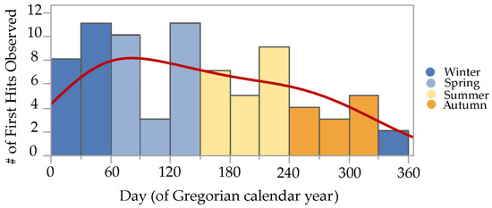 Initial discovery events or “first hits” by Reticulitermes spp. termites observed on cellulose bait matrices (without active ingredients) at five sites during 2019–2021 in the San Francisco Bay Area. Histogram colors demarcate the four Mediterranean climate seasons experienced in California: cool wet spring during days 61–150, hot dry summer during days 151–240, warm dry autumn during days 241–330, and cold wet winter during days 331–365 and 1–60. Red line over histogram shows output from a normal mixture density equation that continuously fits the data.