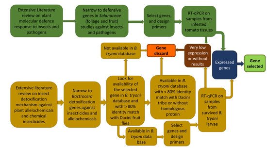 Schematic representation of the workflow used in the present study to choose inducible defence-related genes in tomato fruit and detoxification-related genes in Bactrocera tryoni (from Roohigohar et al., 2021).
