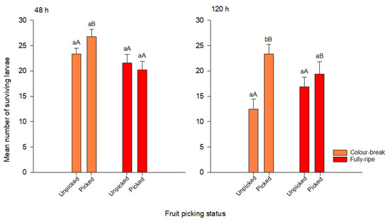 Mean (±1 SE) Bactrocera tryoni larval survival in tomato fruit at two ripening stages (colour break and fully ripe) and of two different picking states (unpicked or picked), at 48 h and 120 h after larval inoculation (starting n = 40 for each ripening × picking status treatment). Each time point includes the fruit picking state compared for each ripening stage (columns surmounted by the same lower-case letter are not significantly different at p = 0.05); fruit ripening stage compared within the picking state (columns surmounted by the same upper-case are not significantly different at p = 0.05).
