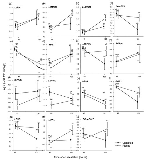 For picked fruit, LecRK1(z = −2.343, p = 0.021), LeMPK1 (t (18) = −4.255, p < 0.001), LeMPK2 (t (10) = −3.142, p = 0.010), Mi-1.1 (z = −2.873, p = 0.004) and CCoAOMT (t (11) = −2.301, p = 0.030) were expressed significantly higher 120 h after infestation than at 48 h (Figure 3a–c,f,o), while PII (z = −2.419, p = 0.022) and a-AIs1 (z = −2.041, p = 0.041) expressed significantly higher at 48 h than at 120 h (Figure 3e,k, Table 4).