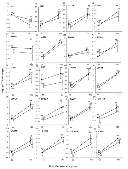 Statistical analysis results of differential gene expression in Bactrocera tryoni larvae reared in unpicked or picked colour-break Roma tomato fruit and collected in 48 h and 120 h after inoculation (when larvae were approximately in their 1st and 2nd instars). The comparative analyses were performed between the following: (A) gene expression from tissue of larvae sampled from unpicked versus picked tomato fruit 48 h after larval inoculation; (B) gene expression from tissue of larvae sampled from unpicked versus picked tomato fruit 120 h after larval inoculation; (C) gene expression from tissue of larvae sampled from unpicked tomato fruit 48 h versus 120 h after larval inoculation; and (D) gene expression from tissue of larvae sampled from picked tomato fruit 48 h versus 120 h after larval inoculation. Analyses were unpaired t-test or Mann–Whitney U test, depending on the error distribution of the data. The 28 selected genes are associated with insect detoxification pathways and are as follows: (1) cytochrome P450 (CP6A9, CP313, CP134, CP4D8, CP6G1, C12E1, CP6T1A, CP6T1B, C12C1, C12B1, C12B2, CP304A, C304B, CP306, C6A14, C4AC2, CP4S3, CP132, CP316 and CP6G2); (2) carboxylesterase (EST F and EST 1); (3) glutathione S-transferase (GST D1, GST T1 and GST T7); (4) ATP-binding cassette (ABC) transporters (ABCG1, ABCA3, SUR, L259 and MDR49). *: p < 0.05.