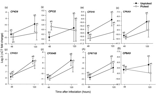 Mean (±1 SE) relative expression (log 2 of 2−ΔCT) of 28 putative detoxification genes (a–z,A,B), as assessed using RT-qPCR, from Bactrocera tryoni larvae extracted from Roma tomato at the colour-break ripening stage. Comparisons are of genes extracted from larvae sampled from fruit at two time periods (48 h and 120 h), after larval inoculation and of two picking states (unpicked and picked); n = 8 fruit for 48 h and n = 7 for 120 h time points and picking status. Lower-case letters reflect significance or otherwise in the comparison across picking status within a time point; upper-case letters reflect significance or otherwise in the comparison within picking status across time points.