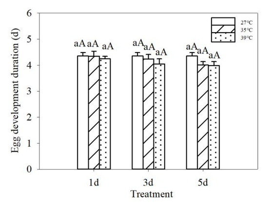 Egg development duration of Leptinotarsa decemlineata after the eggs were repeatedly exposed to different high temperature (35 °C and 39 °C) for 4 h during 1, 3 and 5 days. Data are expressed as mean ± SE. Data followed by the same letter in a histogram are not significantly different (p > 0.05).
