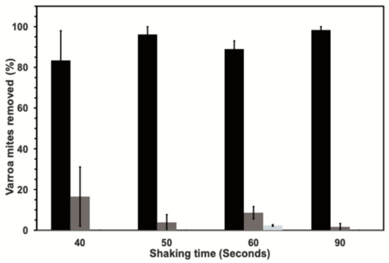 The percentage (mean ± standard err (se)) of Varroa dislodged from collected honey bees by using four different shaking periods. The percentage of mites recovered from the first and second shaking periods are given by black and dark-gray bars, respectively. The percentage of residual mites collected from final visual inspection of bees is also given where observed (light-gray bars).