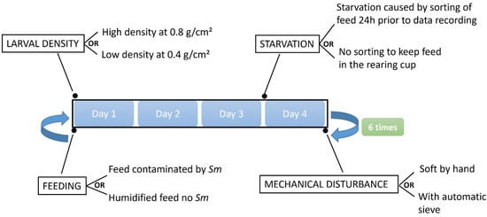 Three abiotic stressors were tested: starvation, larval densification and sieving. Starvation consisted in taking away the feed substrate present in the tray 24 h prior to data collection as shown in Figure 1: Two larval densities were tested, a high density (0.8 g/cm2 of larvae; approximatively 2000 larvae per cup), and a low density (0.4 g/cm2 of larvae; approximatively 1000 larvae per cup) with a mean larval weight of 14 mg, about 6 weeks after egg hatching. Sieving was applied to separate the larvae from the feces. High sieving stress was applied for 30 s by the automatic sieve SYSMO from 3R Company, while low sieving stress was applied by separating the larvae by manual sieving using sieves with a diameter of 200 mm and a mesh of 0.8 mm from Retsch Company, Eragny, France).