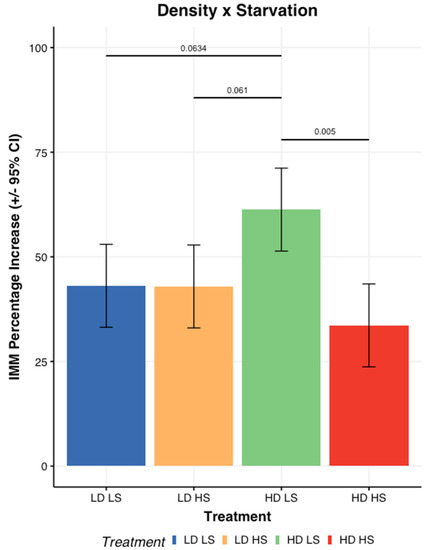 Among the different abiotic stress factors tested, density and starvation seemed to have the most impact on physiological factors. A half normal plot for IMM relative gain indicated an interaction between density and starvation. A subsequent analysis of variance (ANOVA) confirmed a significant interaction between density and starvation level (F1,12 = 9.15, p = 0.011). Figure 2 shows a statistically significant difference between starved larvae and non-starved larvae at high density. The IMM relative gain for the high-density non-starved larvae was approximately 61.3% and 33.6% for the starved larvae. No significant differences could be detected between the IMM relative gain at low density between the larvae that were starved (42.6%) or not (43.1%). Finally, no significant differences were detected among the high-density starved larvae and the low-density ones.